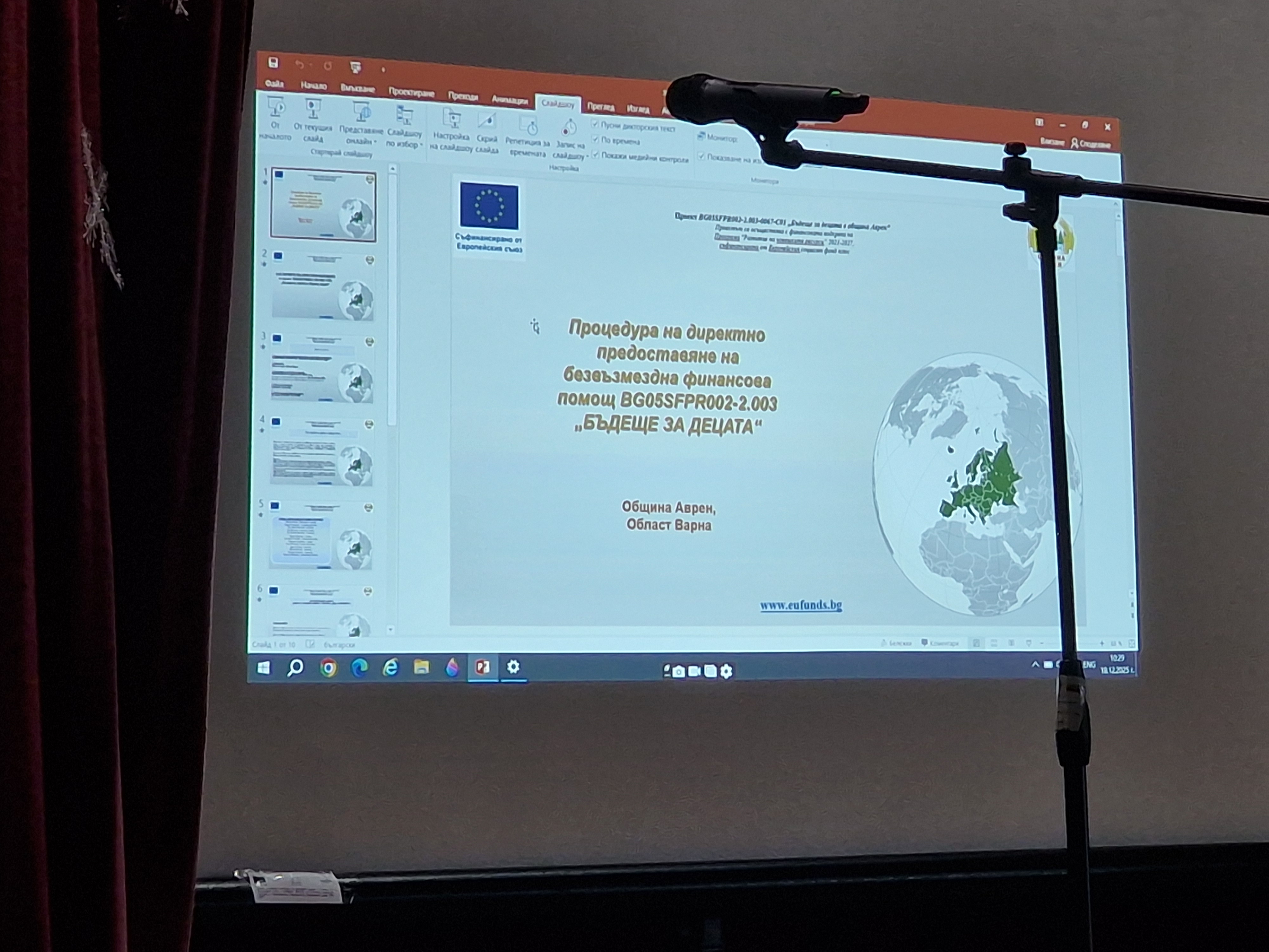 На 18.12.2025г. в залата на НЧ „П.Р.Славейков-1901“, се събраха всички деца, родители, преподаватели, ръководството на Община Аврен, жители и гости на Община Аврен, специалистите работили в рамките на проект BG05SFPR002-2.003-0067-C01 „Бъдеще за децата в община Аврен“, осъществен чрез процедура за директно предоставяне BG05SFPR002-2.003 „БЪДЕЩЕ ЗА ДЕЦАТА“ по Програма „Развитие на човешките ресурси“2021-2027, съфинансирана от Европейския социален фонд плюс. Идеята бе всички заедно да отпразнуват, това което си отива и това което идва под мотото: „Благодарим за грижите“, с празничен концерт на таланантливите деца, изложба на рисунки и ръчно изработени предмети за благотворителен пазар, и не на последно място магията на подаръците раздадени от Дядо Коледа.