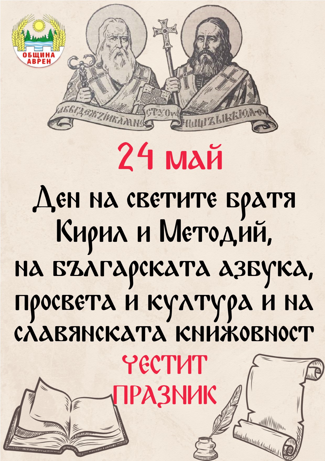 На 24 май отбелязваме един от най-светлите празници в нашата история – Деня на светите братя Кирил и Методий, на българската азбука, просвета и култура и на славянската книжовност. Този ден е мост между миналото и бъдещето ни, напомня ни за силата на знанието и непреходната стойност на книгата като светило и пазител на идентичността ни.