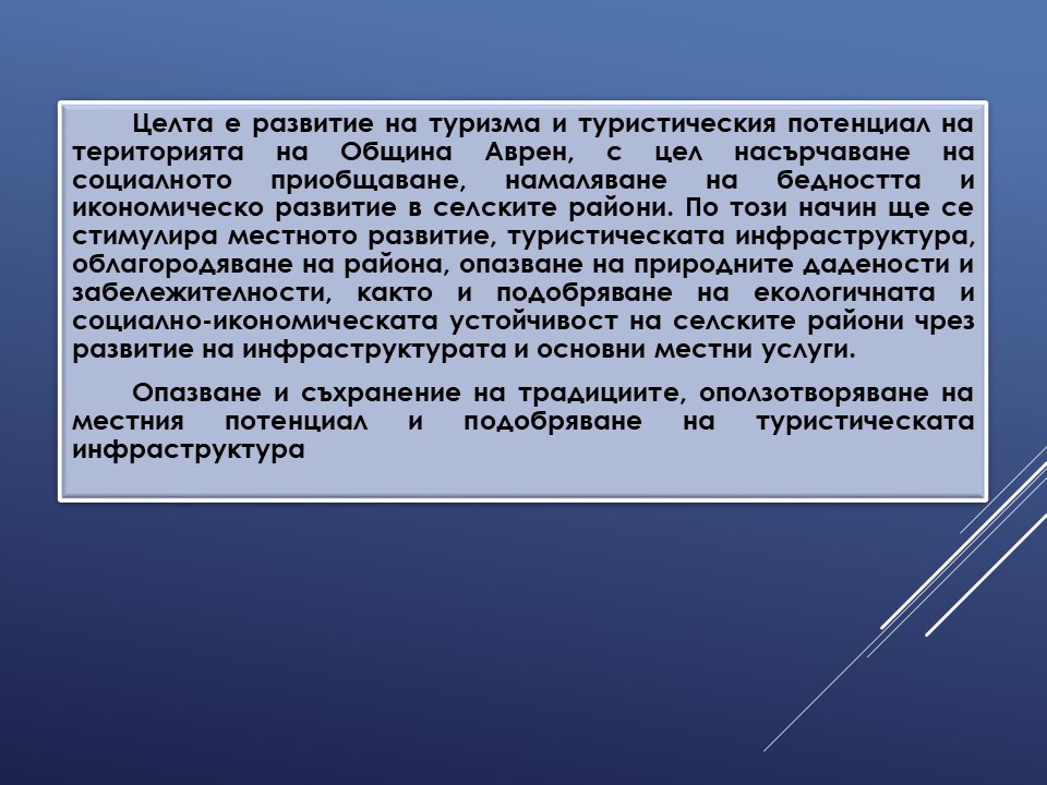 Целта на проектната идея е развитие на туризма и туристическия потенциал на територията на Община Аврен, с цел насърчаване на социалното приобщаване, намаляване на бедността и икономическо развитие в селските райони.